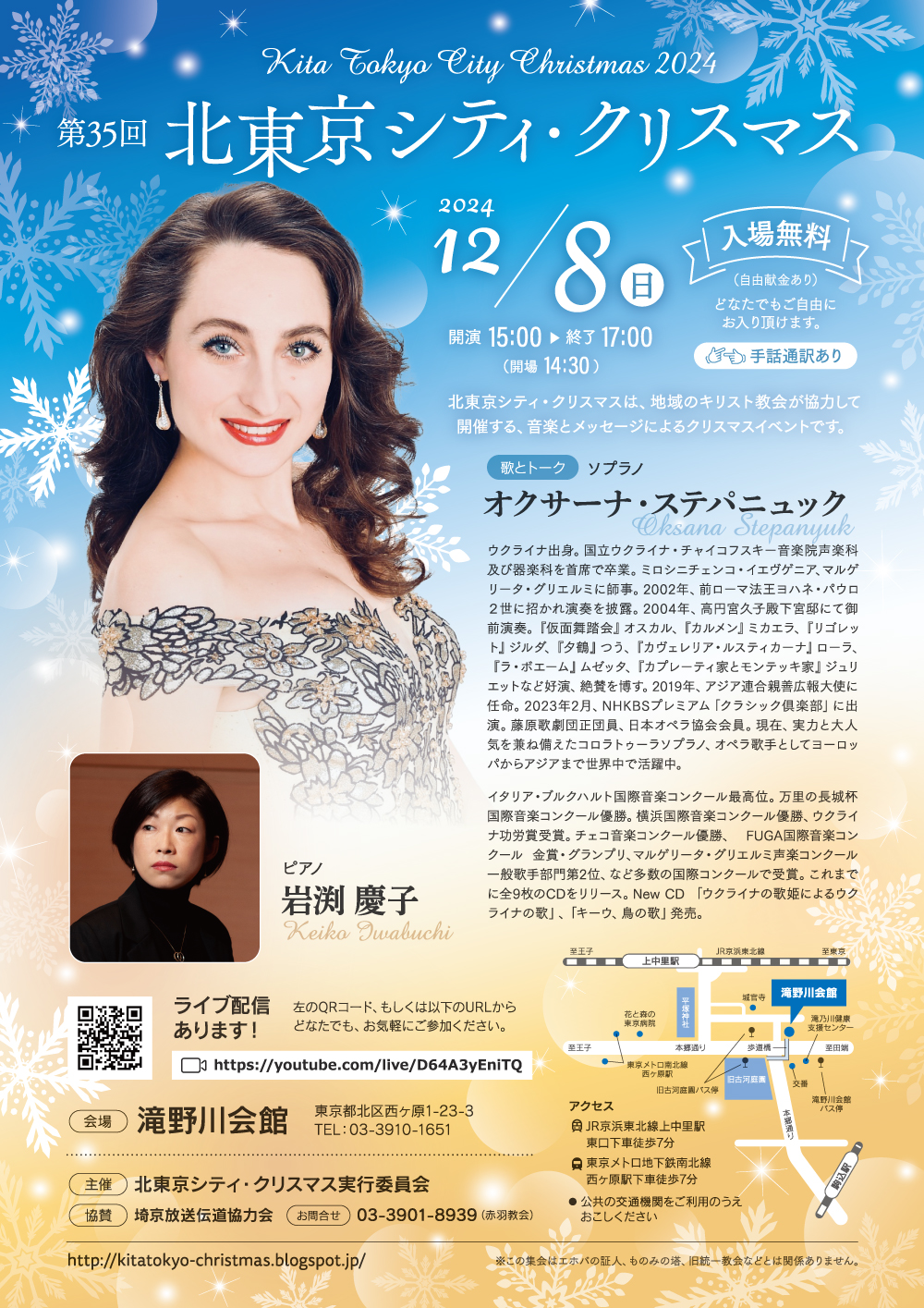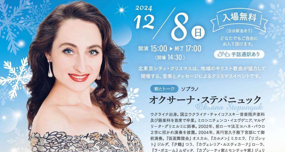 ここ数年はコロナウイルス感染の波が押し寄せるなかで開催してきましたが、今年は少し落ち着きをみせているなか、地域の教会が協力して「北東京シティ·クリスマス」のために祈り、できる限りの準備をしてきました。今年はウクライナ出身のソプラノ歌手オクサーナ・ステパニュックさんをお迎えすることができました。国立ウクライナ・チャイコフスキー音楽院を首席で卒業、2002年にはローマ教皇ヨハネ·パウロ二世に招かれ演奏を披露されました。イタリア・ブルクハルト国際音楽コンクールなど多数の国際音楽コンクールで受賞されています。これまで9枚のCDをリリースするなど、コロラトゥーラソプラノ、オペラ歌手としてヨーロッパからアジアまで世界中で活躍中です。オクサーナ·ステパニュックさん素晴らしい歌声によって、ご一緒にクリスマスの喜び、恵みを味わわせていただきたいと願っています。